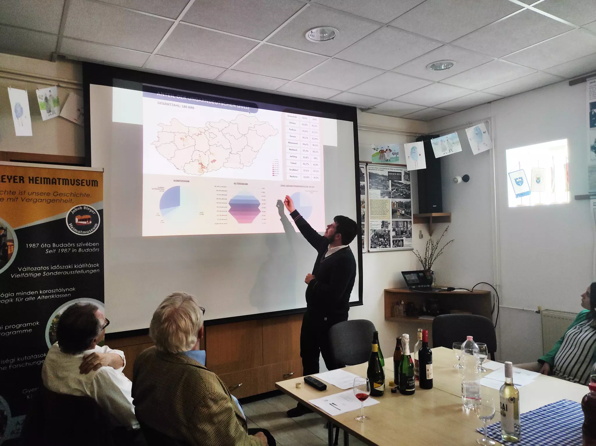 Als Schlussakkord der Veranstaltung gab Patrik Schwarcz-Kiefer einen detailreichen Vortrag mit dem Titel „Was die Statistiken zeigen? Aktueller Zustand der Volksgruppe“. Schwarcz-Kiefer als internationaler Ökonom und Experte der Internationalen Beziehungen führte in den vergangenen Jahren eingehende statistische Forschungen zur demografischen Entwicklung unserer ungarndeutschen Nationalitätengemeinschaft durch. In seinem Vortrag legte er besonderes Augenmerk auf das Komitat Branau sowie auf die als Schwäbische Türkei bekannte südungarische Region. Dabei konnte er aufzeigen, dass die Assimilation und Abwanderung der autochthonen deutschen Bevölkerung aus Südungarn in jüngerer Zeit stetig zunahm und sich beschleunigte.
